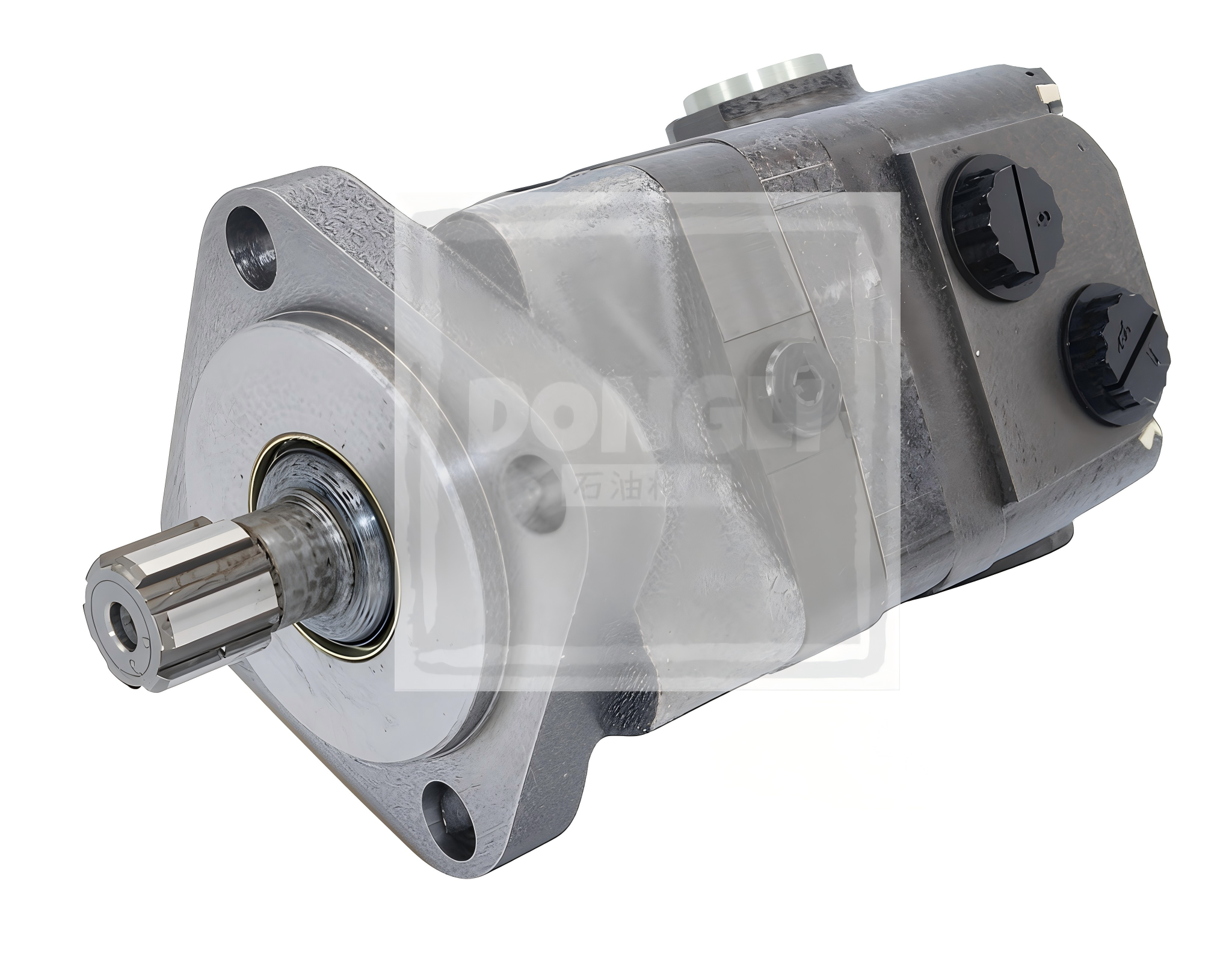 4-Bolt Hydro Motor WF1043087Y (1" 6B Spline). A356-T6 housing + 42CrMo4 shaft (HRC58-62). 350Bar/220N·m output - SAE 6B compliant for slurry pump drives.